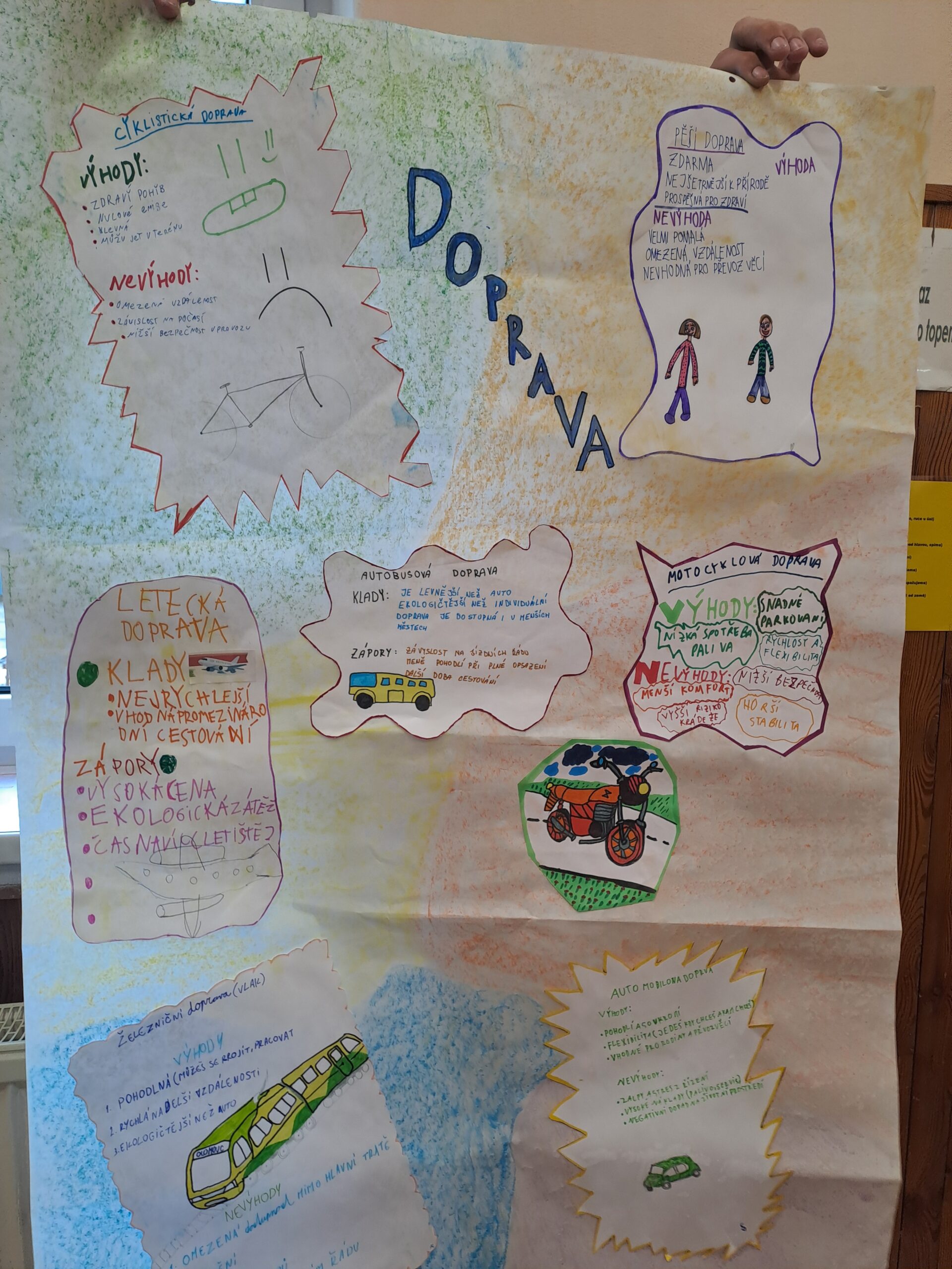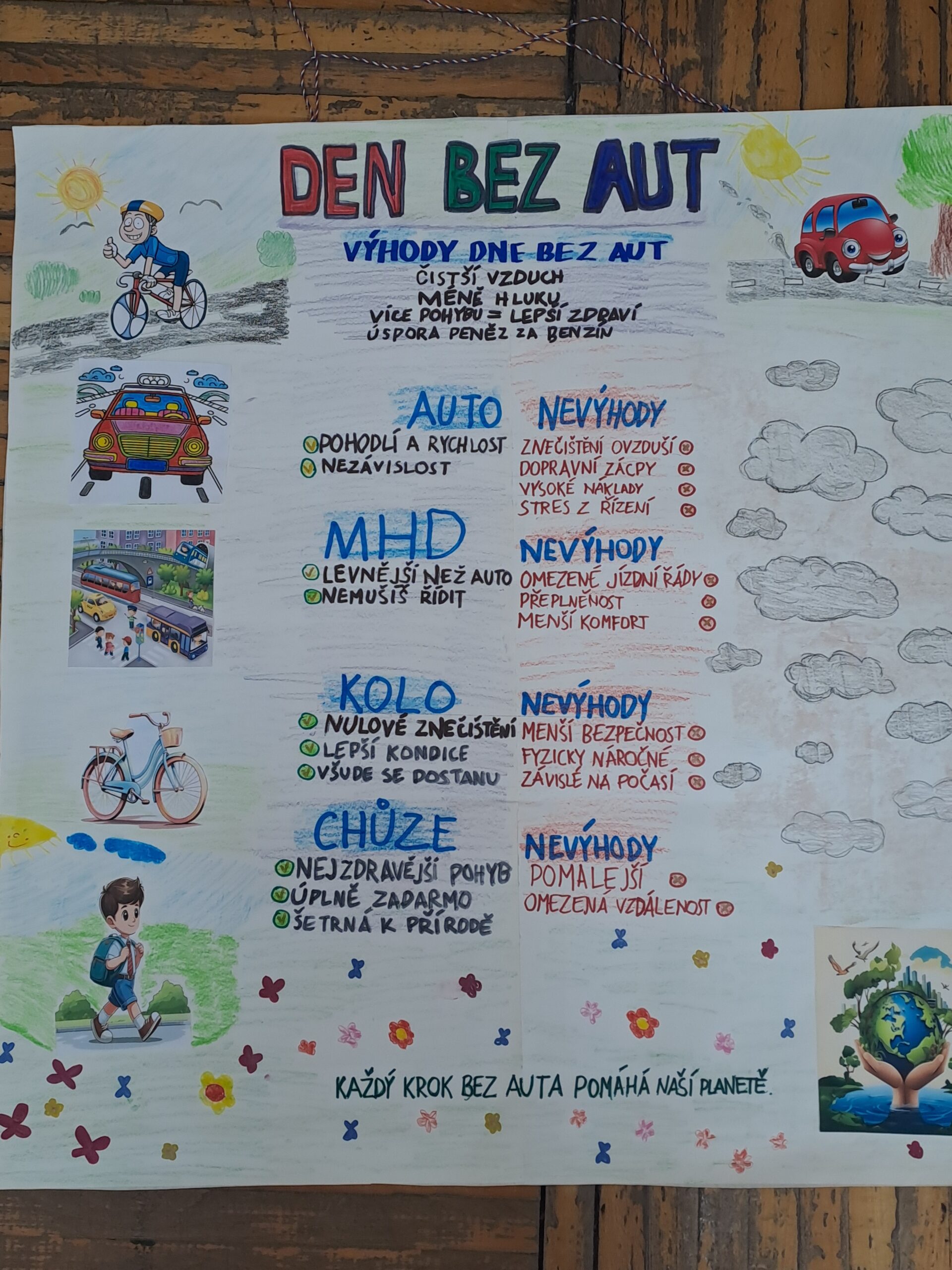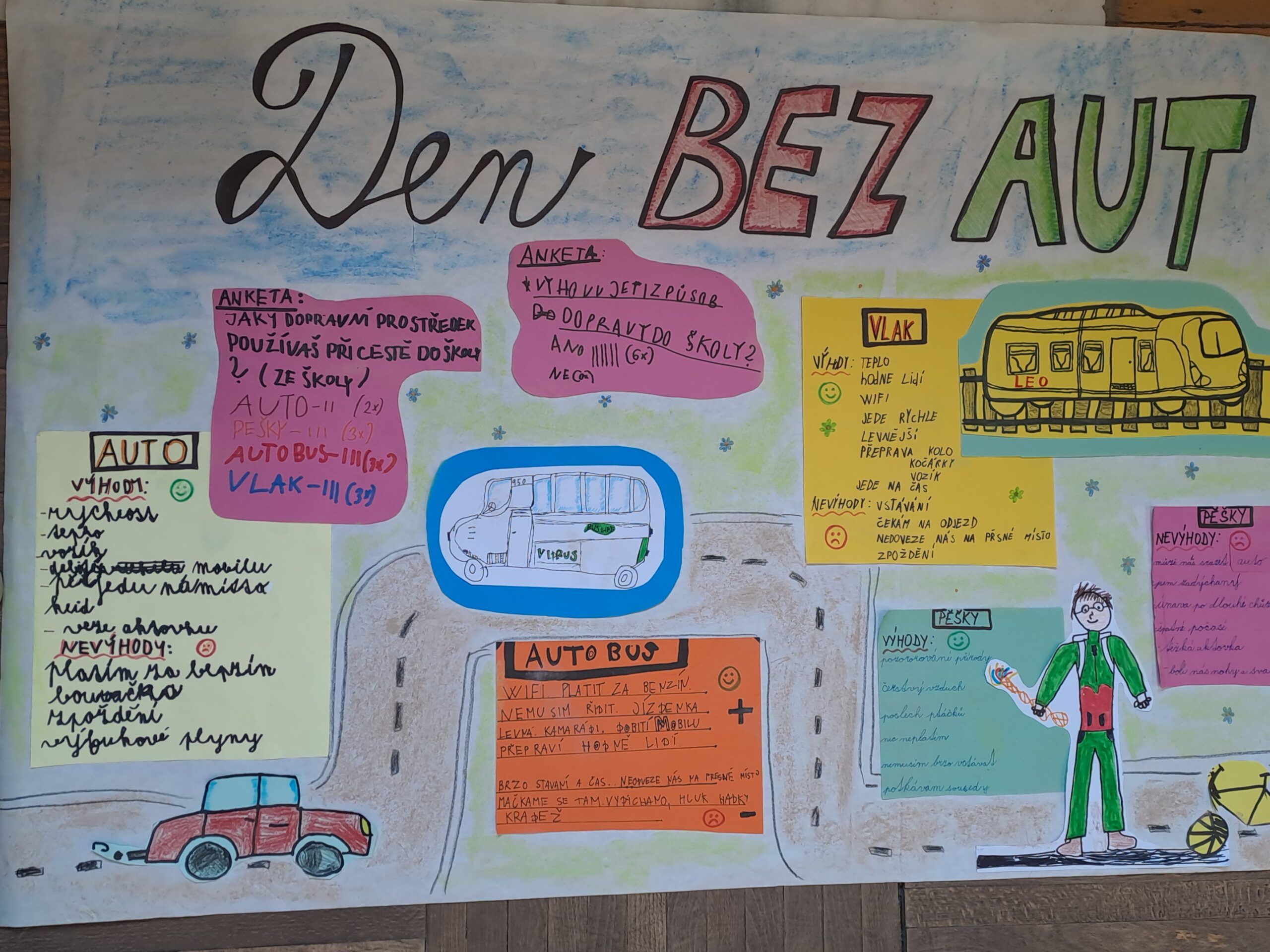 V pondělí 30.3. jsme s žáky naší školy realizovali projektový den „Den bez aut“. Děti nejprve odpovídaly na anketní otázku, jaký dopravní prostředek používají při cestě do školy. Následně děti hledaly výhody a nevýhody jednotlivých druhů dopravy a tvořily prezentace. Součástí programu byla také simulační hra „Město“, ve které si žáci mohli vyzkoušet rozhodování mezi jízdou na kole a autem. Společně jsme dospěli k závěru, že automobilová doprava výrazně zatěžuje životní prostředí, zatímco jízda na kole je šetrnější a ekologičtější. V další části děti rozvíjely svou kreativitu při kresbě imaginárního dopravního prostředku budoucnosti, který by byl ohleduplný k přírodě. Na závěr děti představily spolužákům své obrázky a prezentace.
