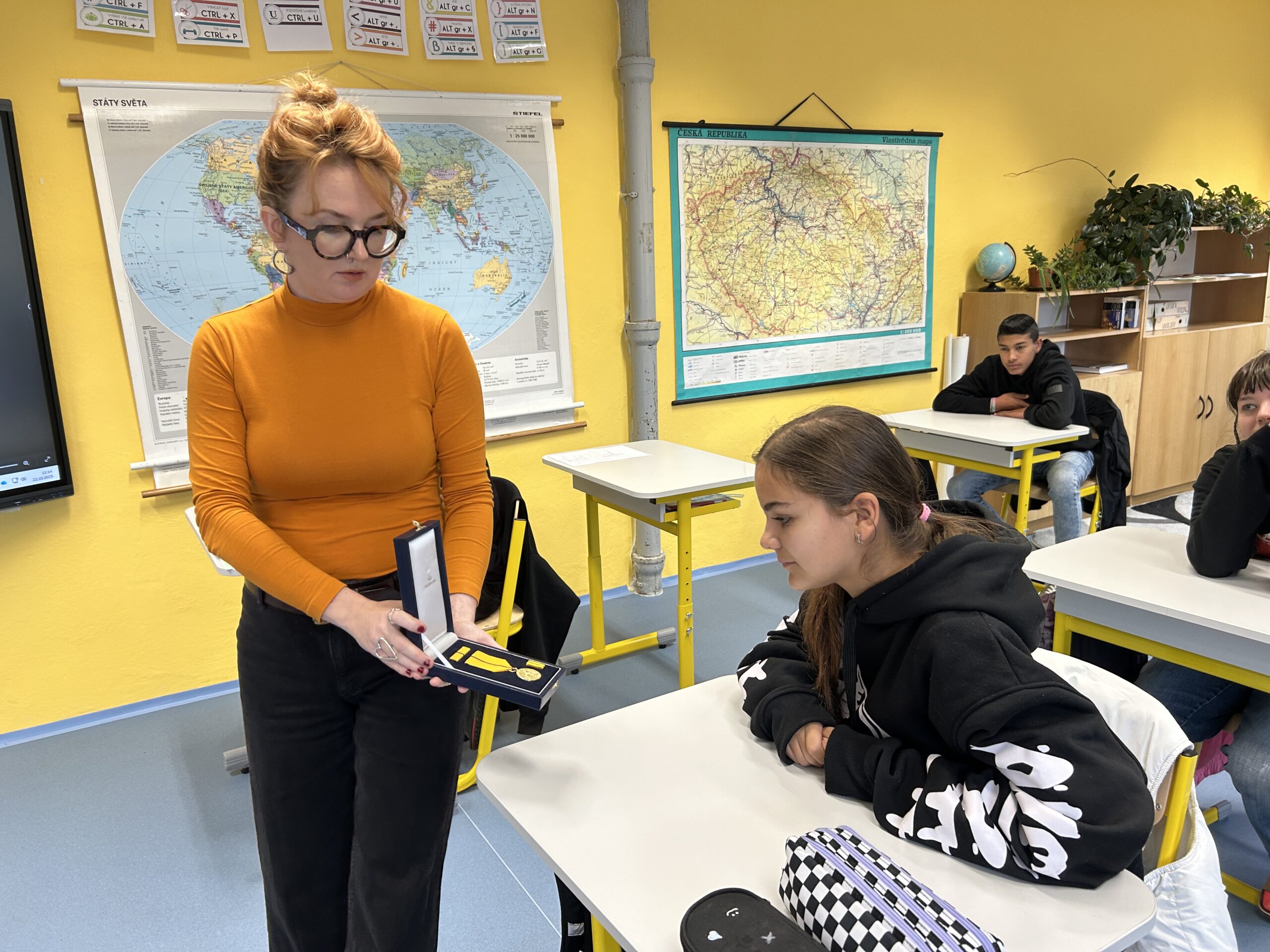 Paní Hyblerová téměř před rokem, 28. října 2024, převzala z rukou prezidenta České republiky Petra Pavla státní vyznamenání za zásluhy – a my jsme velmi hrdí, že zavítala právě k nám.