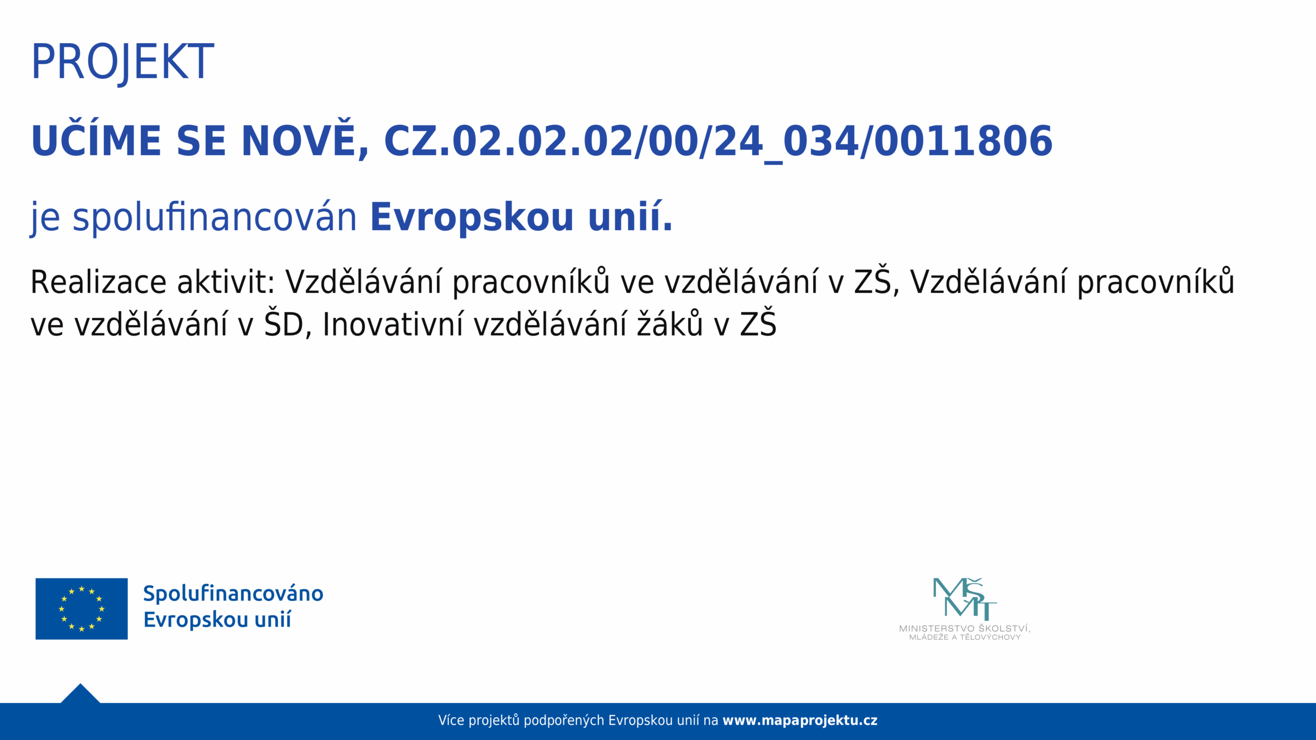 Projekt Učíme se hrou, reg. č. CZ.02.3.X/0.0/0.0/20_080/0020827s celkovou částkou 233.426,- Kč je realizován od 1. 9. 2021 do 30. 6. 2023.
